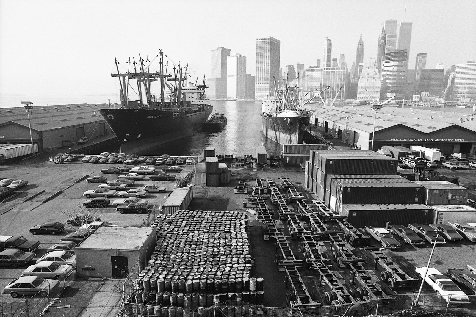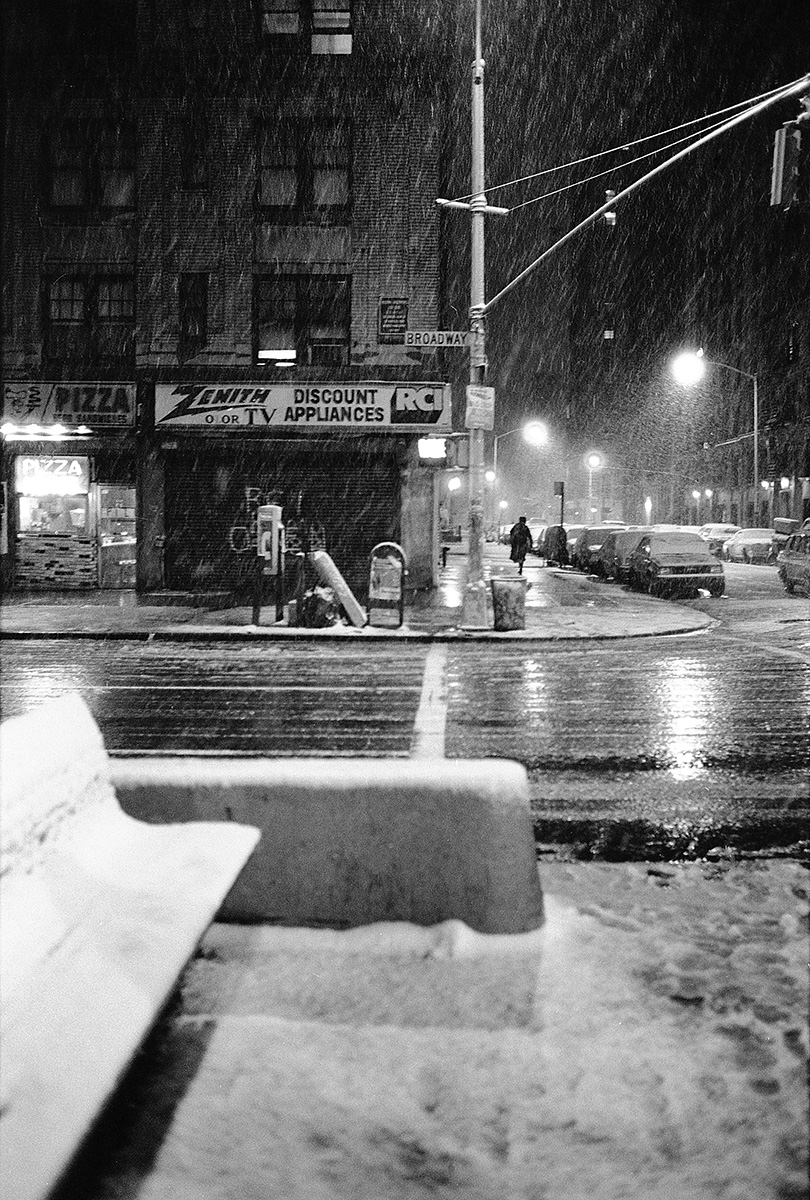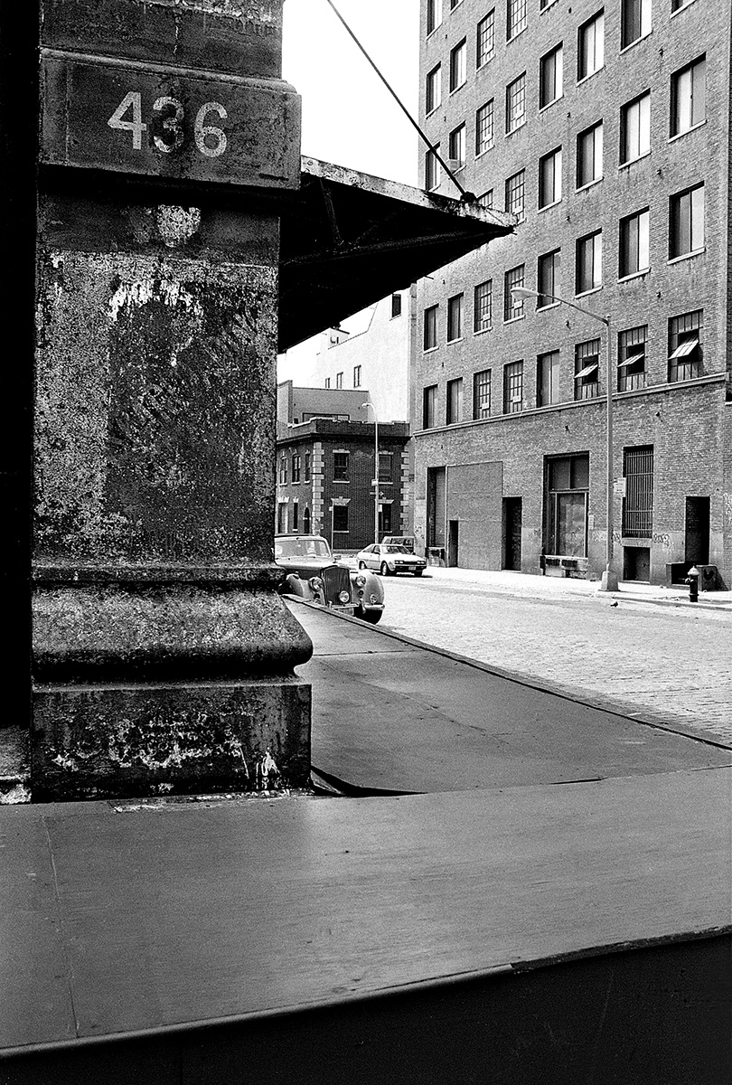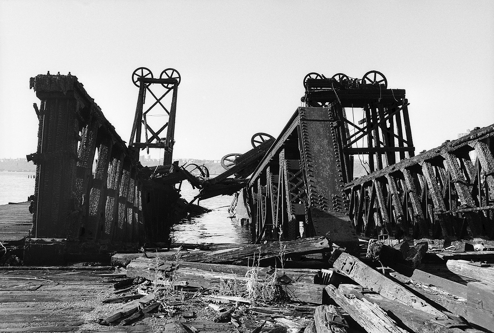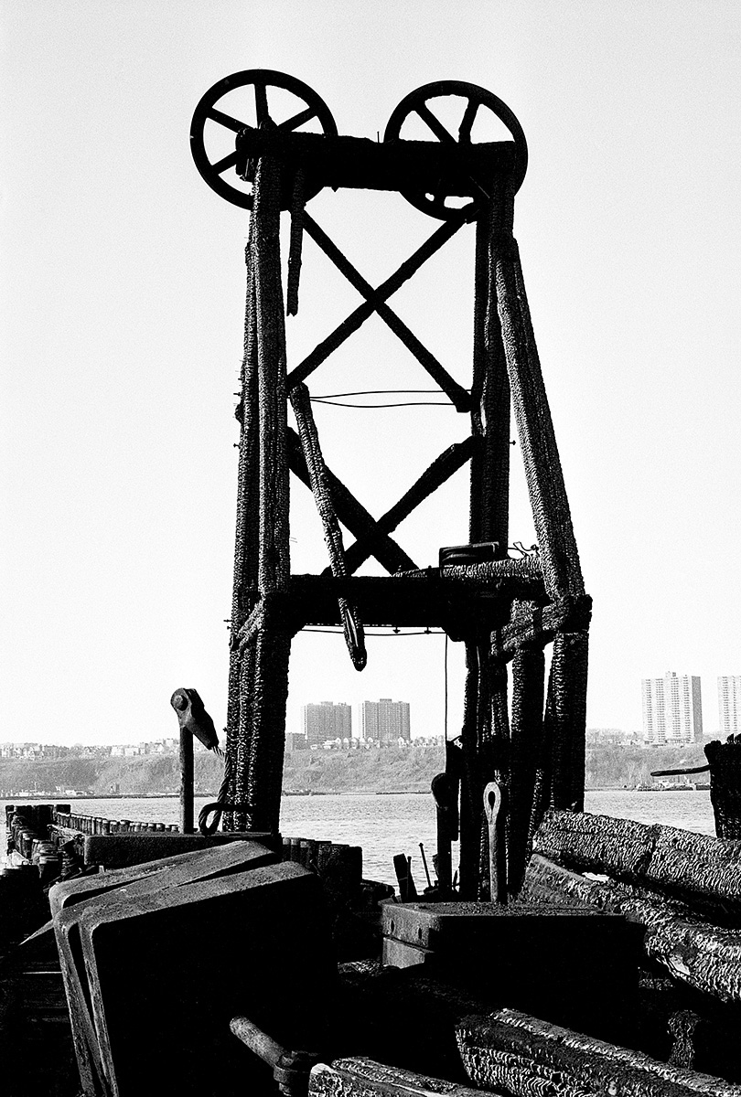 C’était un hiver glacé. Il neigeait et j’aimais photographier la nuit et la pluie. Mon ami écrivain Claude Jacot connaissant mes gôuts atypiques pour les lieux insolites m’emmena au nord de Manhattan sur le site d’un grand port brulé dont les ruines calcinées m’attiraient. Leurs formes noires devenues des sculptures se découpaient sur le ciel pâle, dressant le décor d’un film de science fiction.