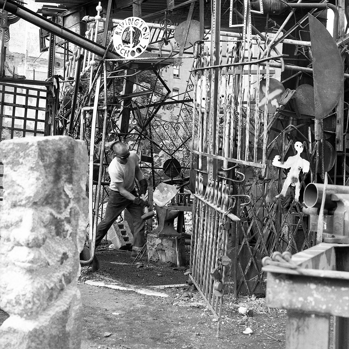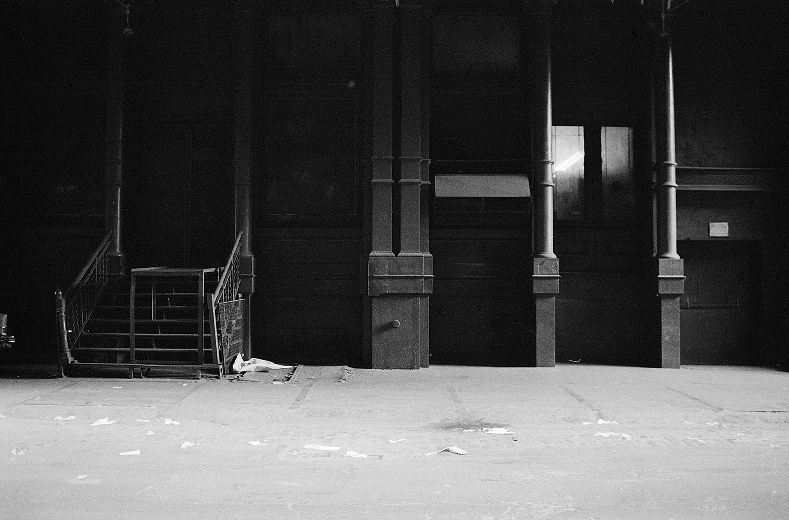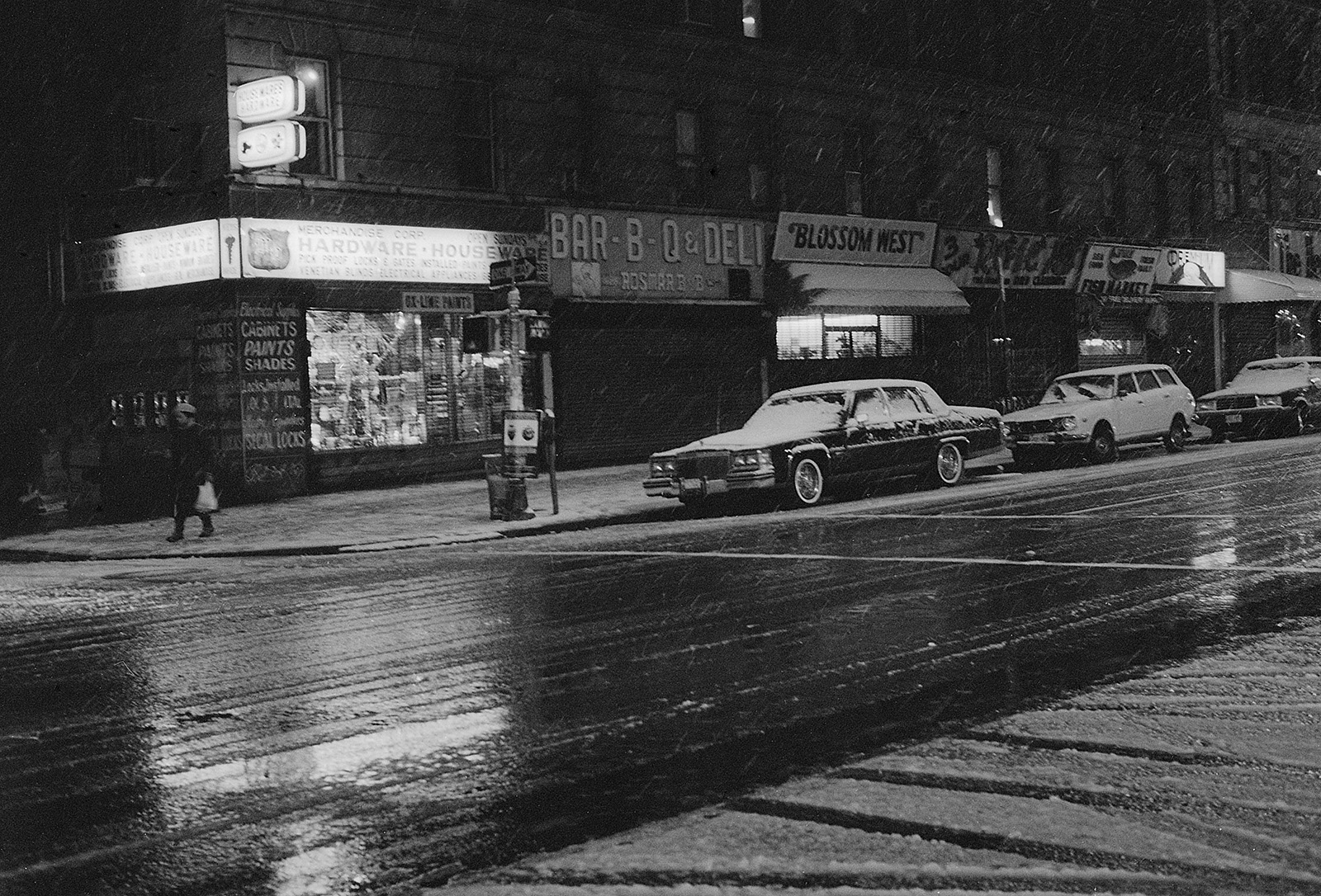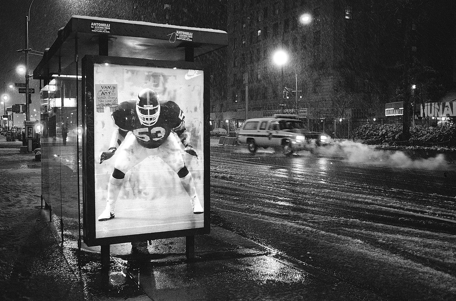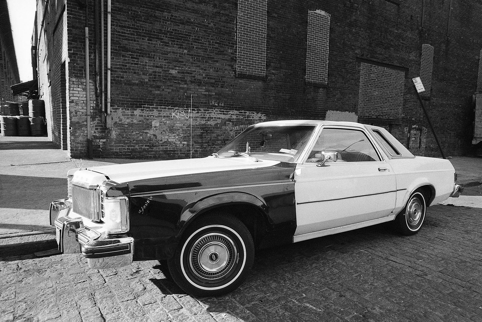 C’était un hiver glacé. Il neigeait et j’aimais photographier la nuit et la pluie. Mon ami écrivain Claude Jacot connaissant mes gôuts atypiques pour les lieux insolites m’emmena au nord de Manhattan sur le site d’un grand port brulé dont les ruines calcinées m’attiraient. Leurs formes noires devenues des sculptures se découpaient sur le ciel pâle, dressant le décor d’un film de science fiction.