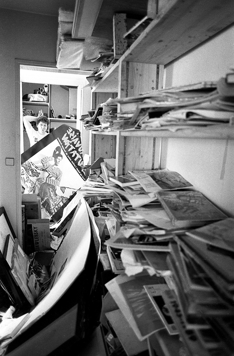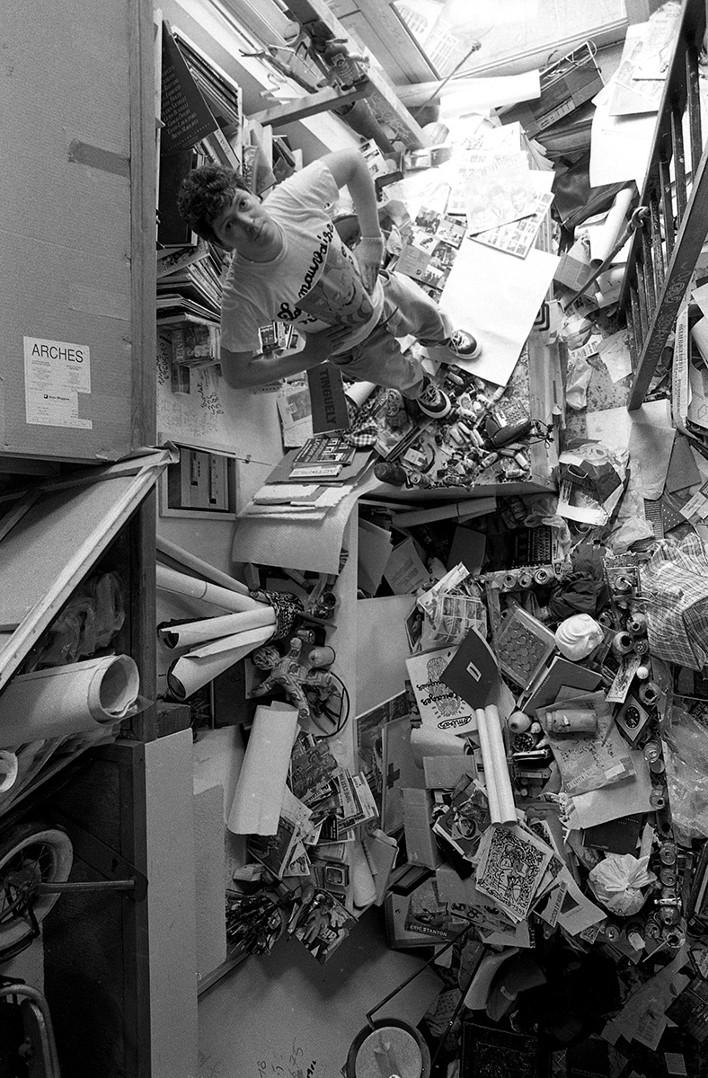 J’ai trouvé fascinant cette accumulation étouffante d’où sortent des oeuvres essentielles et pour cela, j’ai choisi des points de vue inattendus et acrobatiques qui révèlent le décor encombré mais subversif de son antre d’alors, près du Centre Pompidou à Paris. Robert s’est prété à cette séance avec humour et provocation, c’est cela un artiste pratiquant aussi la distance, -bien qu’au niveau des espaces ce fut étroit-, et la dérision… Chapeau l’artiste !
