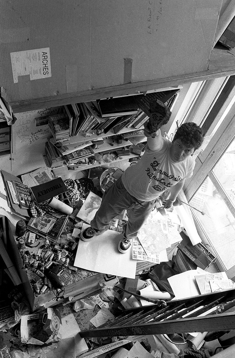 Robert Combas a été mon voisin pendant quelques années et nous avons partagé la présence d’un chat qui se prenait pour un alpiniste des arbres dans notre jardin partagé ! Ce n’est pas pour cela que j’ai photographié l’artiste Combas dans son atelier…, mais pour sa capacité, comme d’autres grands peintres (je pense aux photos de l’atelier de Bacon) à travailler dans un désordre créatif à l’extrême.