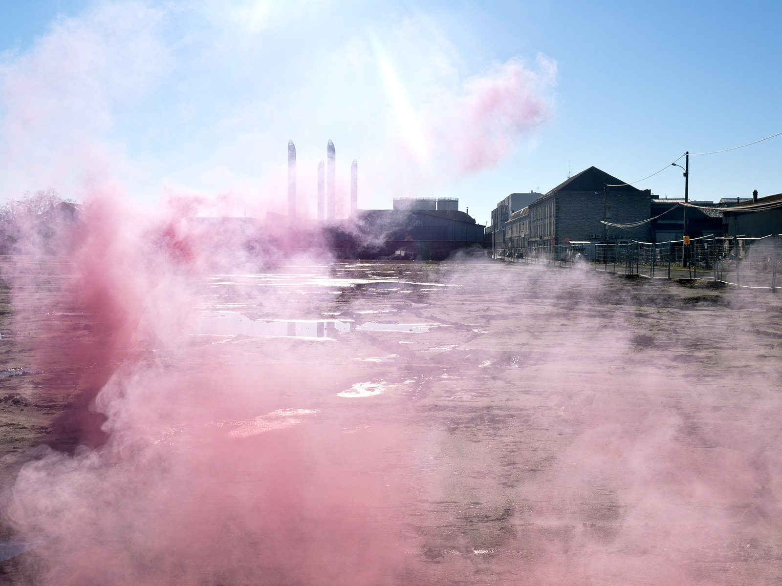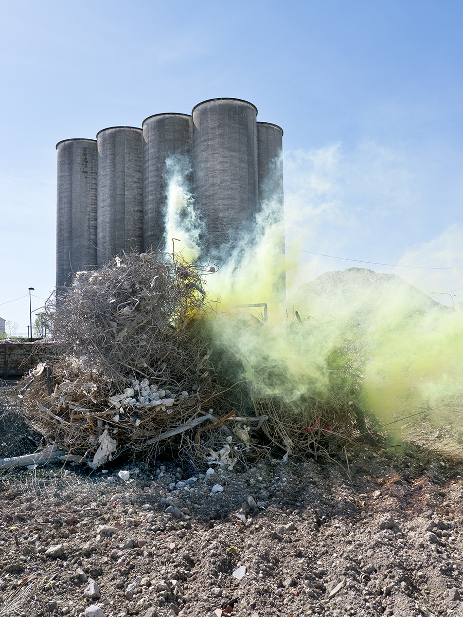 Taguer les paysages et les vues urbaines de ces fumées de couleur, - dans leur légereté et leur dérision -, signifie pour moi la fragilité d’un état et sa disparition, mais aussi la révolte devant la modification d’un quartier, l’effacement de la mémoire ouvrière et maritime, la densification urbanistique irresponsable, (le quartier portuaire de Bacalan), ou la crainte d’une pollution majeure sur un site naturel (les plages de l’Atlantique).