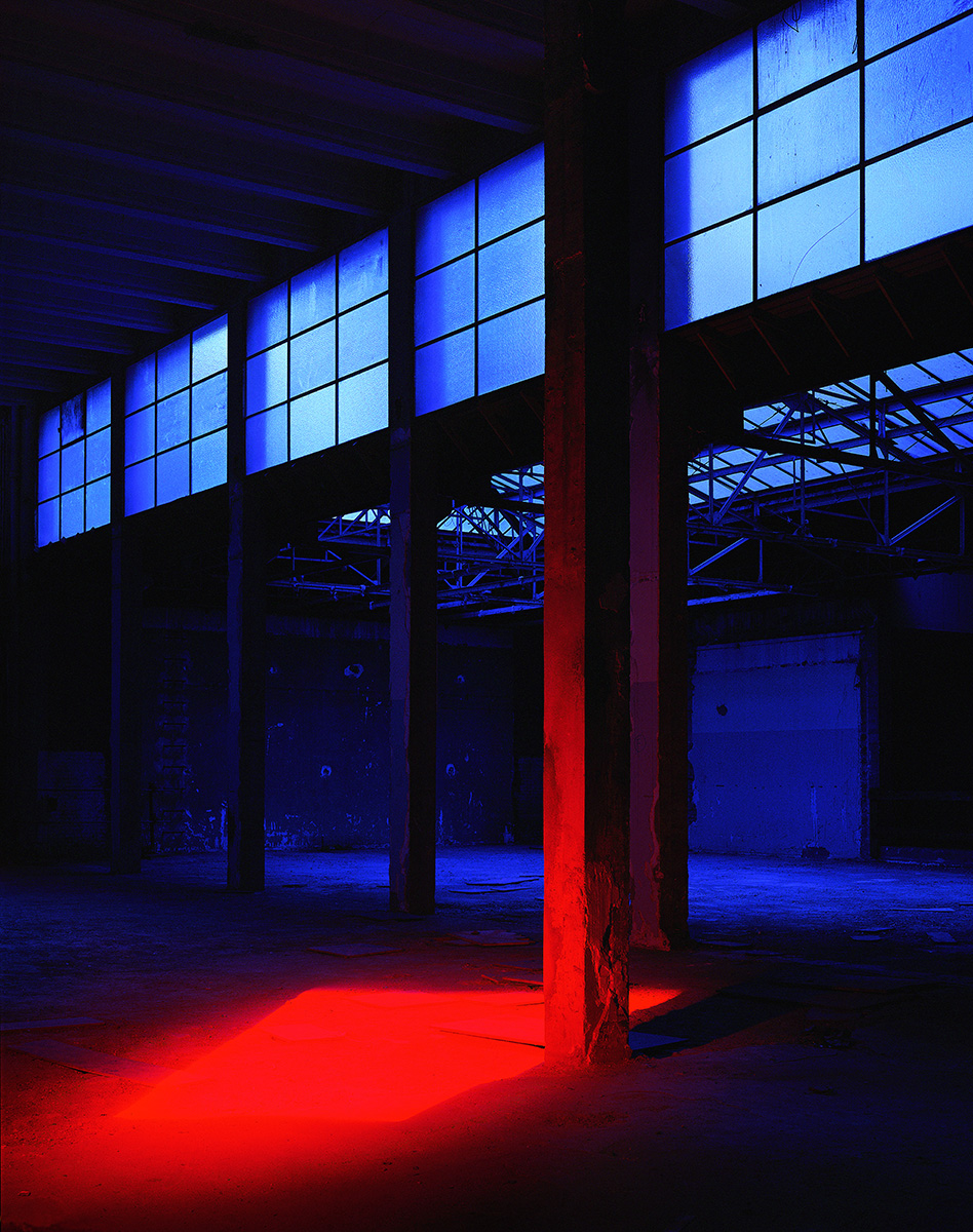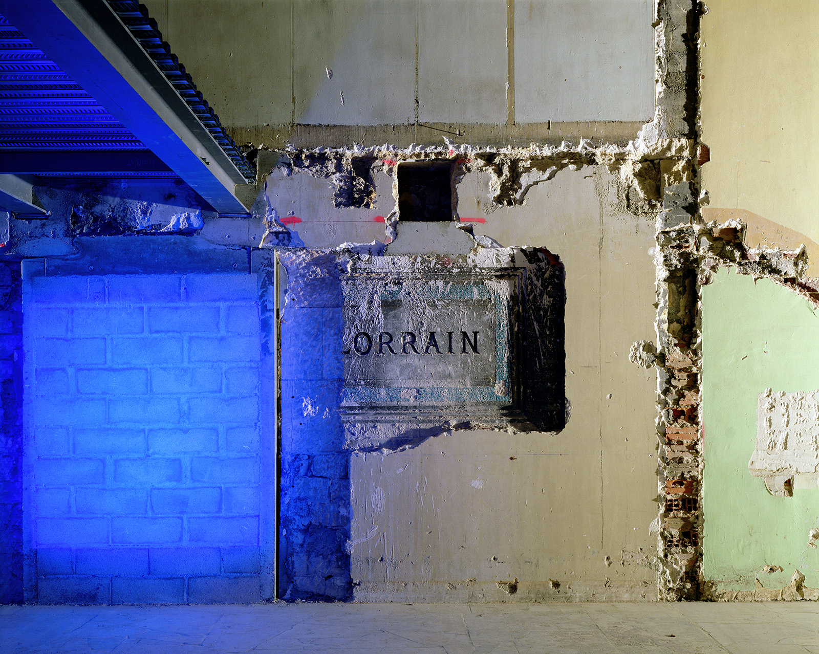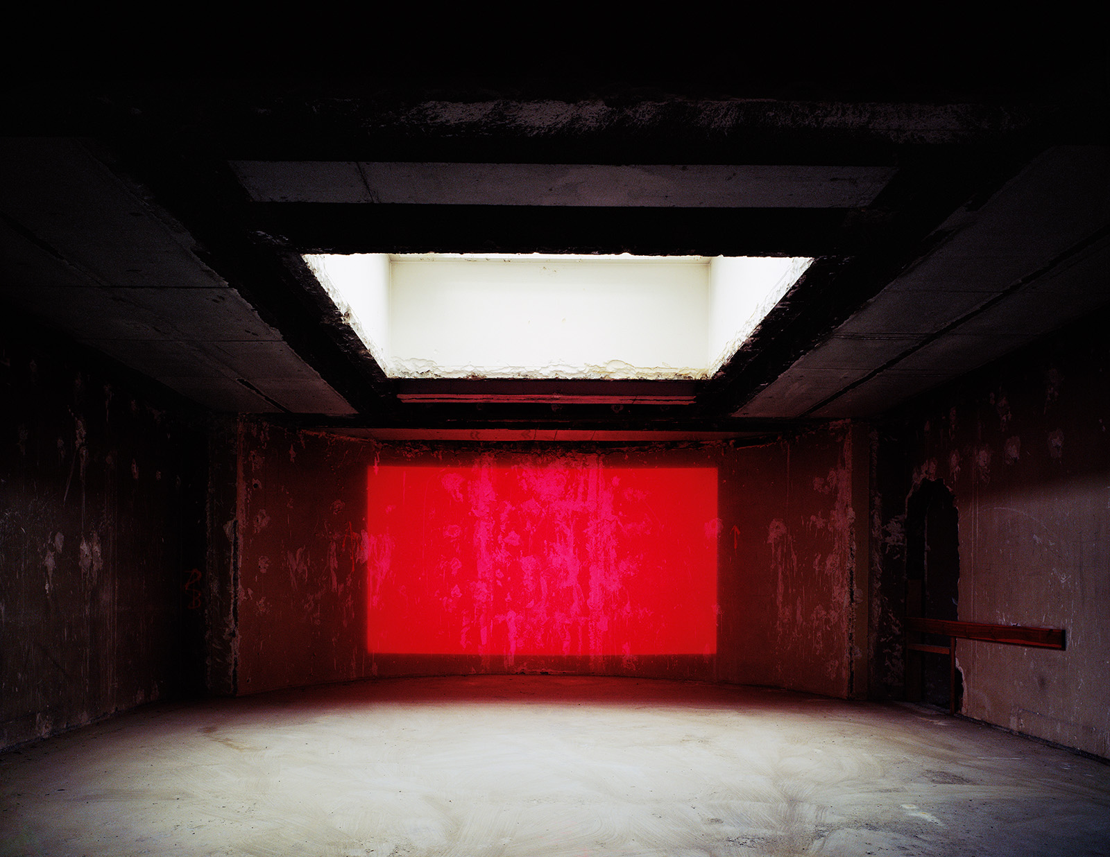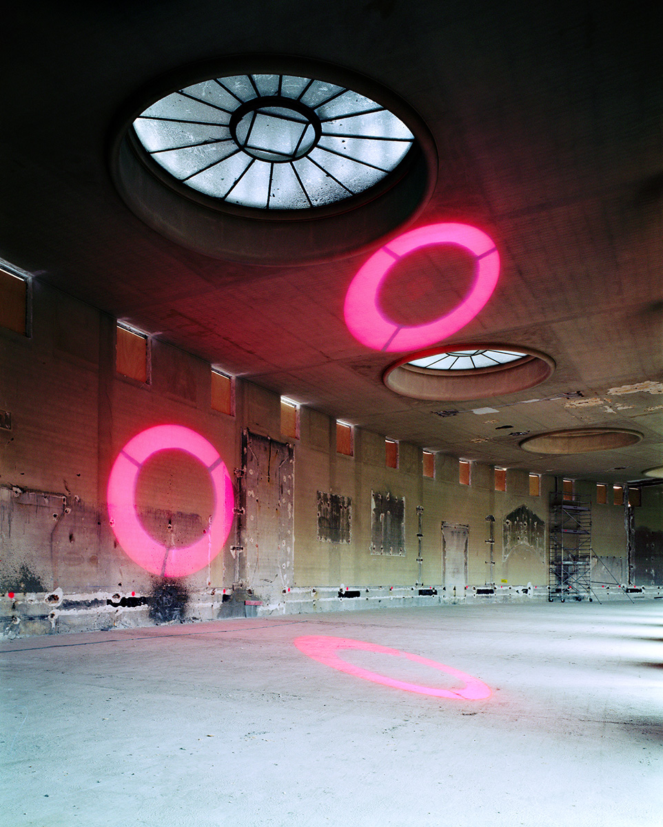 Au début des années 2000, les palais du Trocadero étaient en travaux. Dans l’entre-deux de la rénovation, j’ai pu obtenir les clès de ces monuments des années 30. Ne pouvant pas utiliser les pigments avec lesquels j’avais « taguée » la Base sous Marine de Bordeaux, j’ai choisi de projetter ces mêmes monochromes à l’aide d’un projecteur à découpe de théatre et de dessiner la lumière avec des