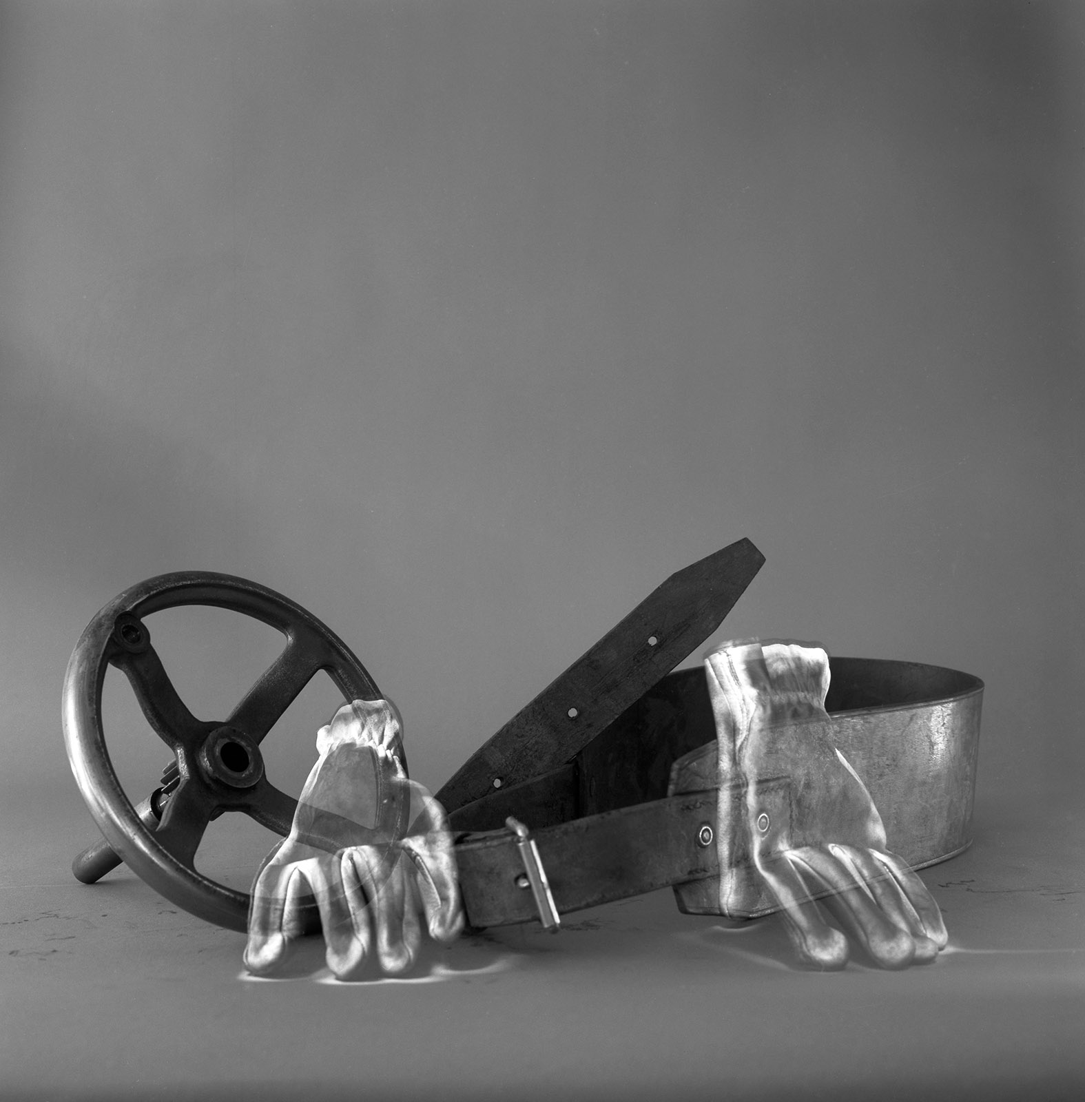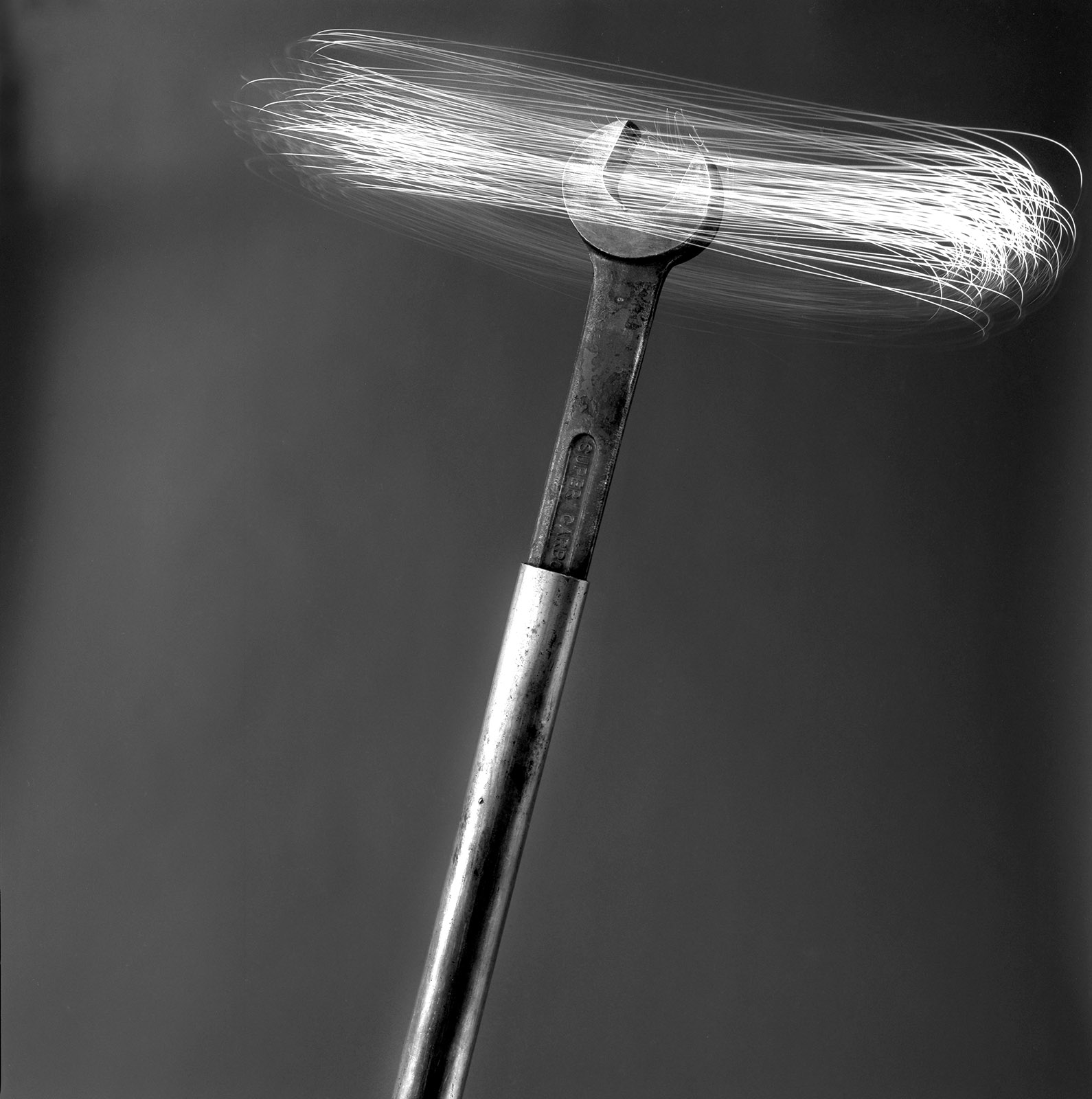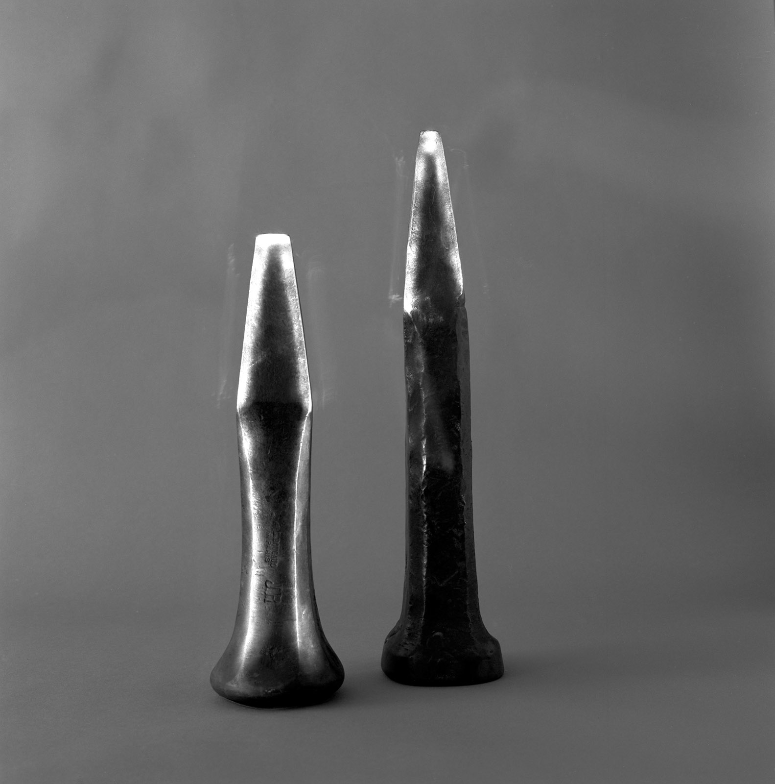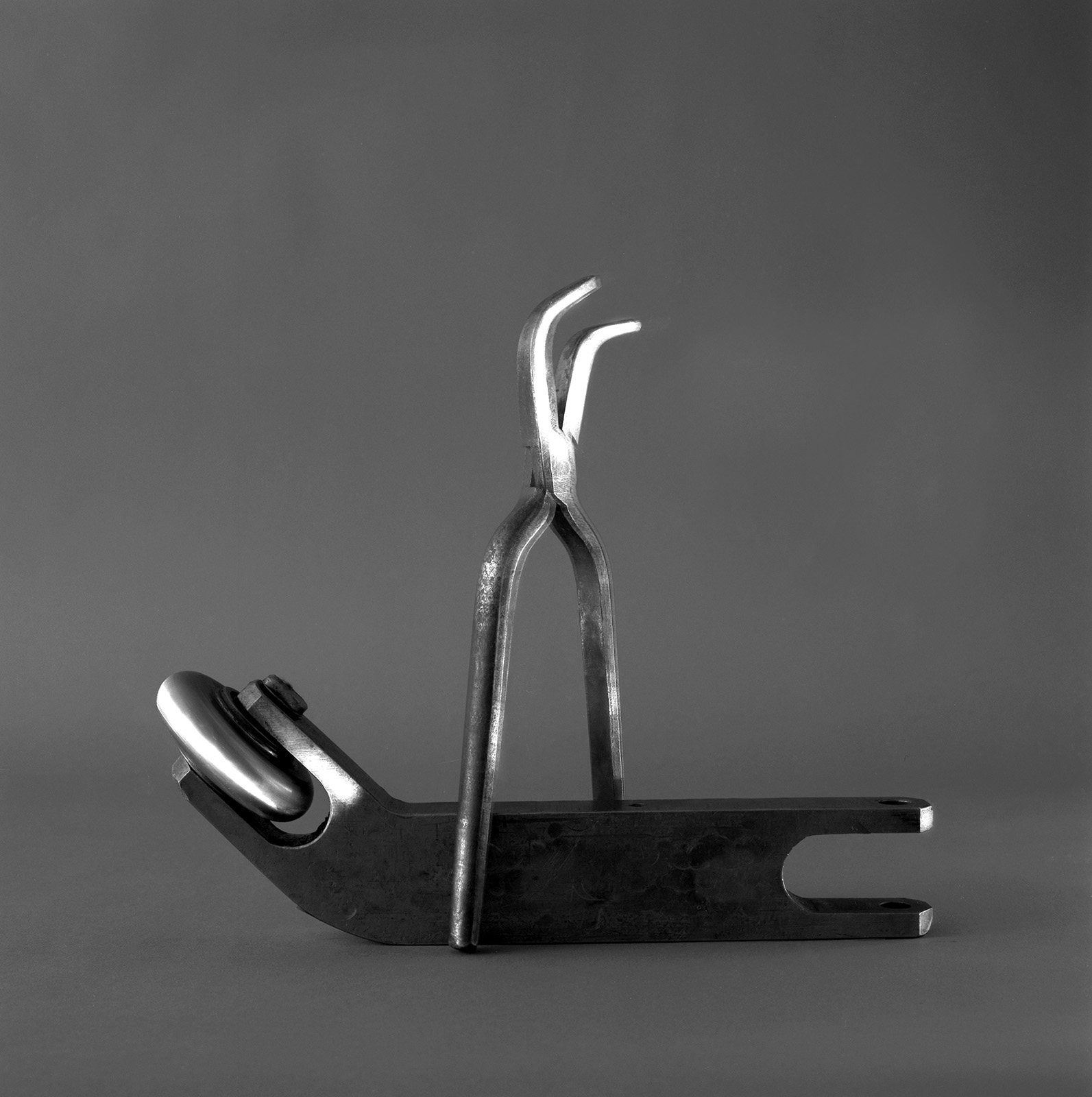 A côté de mon atelier rue Oberkampf, se trouvait toujours, mais pour peu de temps, un des derniers tourneur repousseur de Paris.En 1999, j’ai « emprunté » ces outils au Tourneur pour les photographier, les mettant en scène dans l’atelier, sous mes lumières mais pas dans un but documentaire.Intervenant dans l’ombre et devant un fond gris neutre, les outils sont devenus des icônes du travail du Tourneur, dans l’esprit de rendre hommage au travail manuel qui conduit à créer de simple objets et d’autres plus technologiques comme des nez d’avions de ligne.