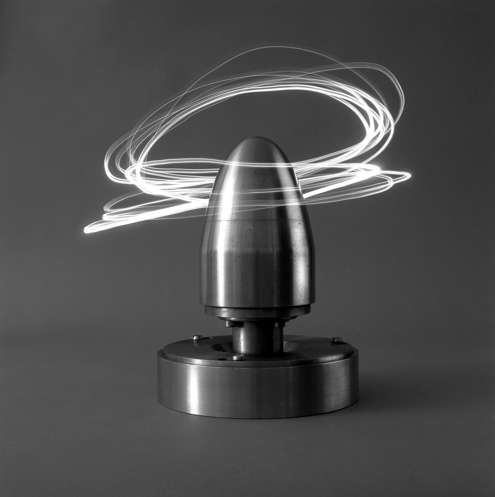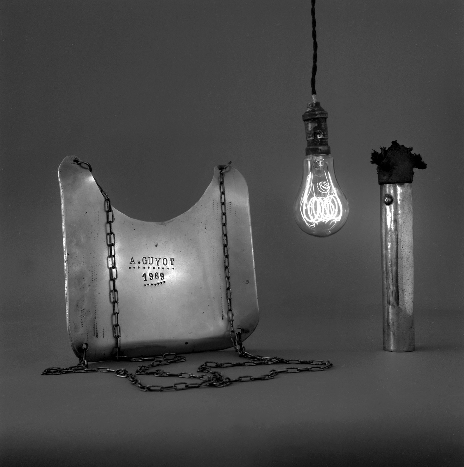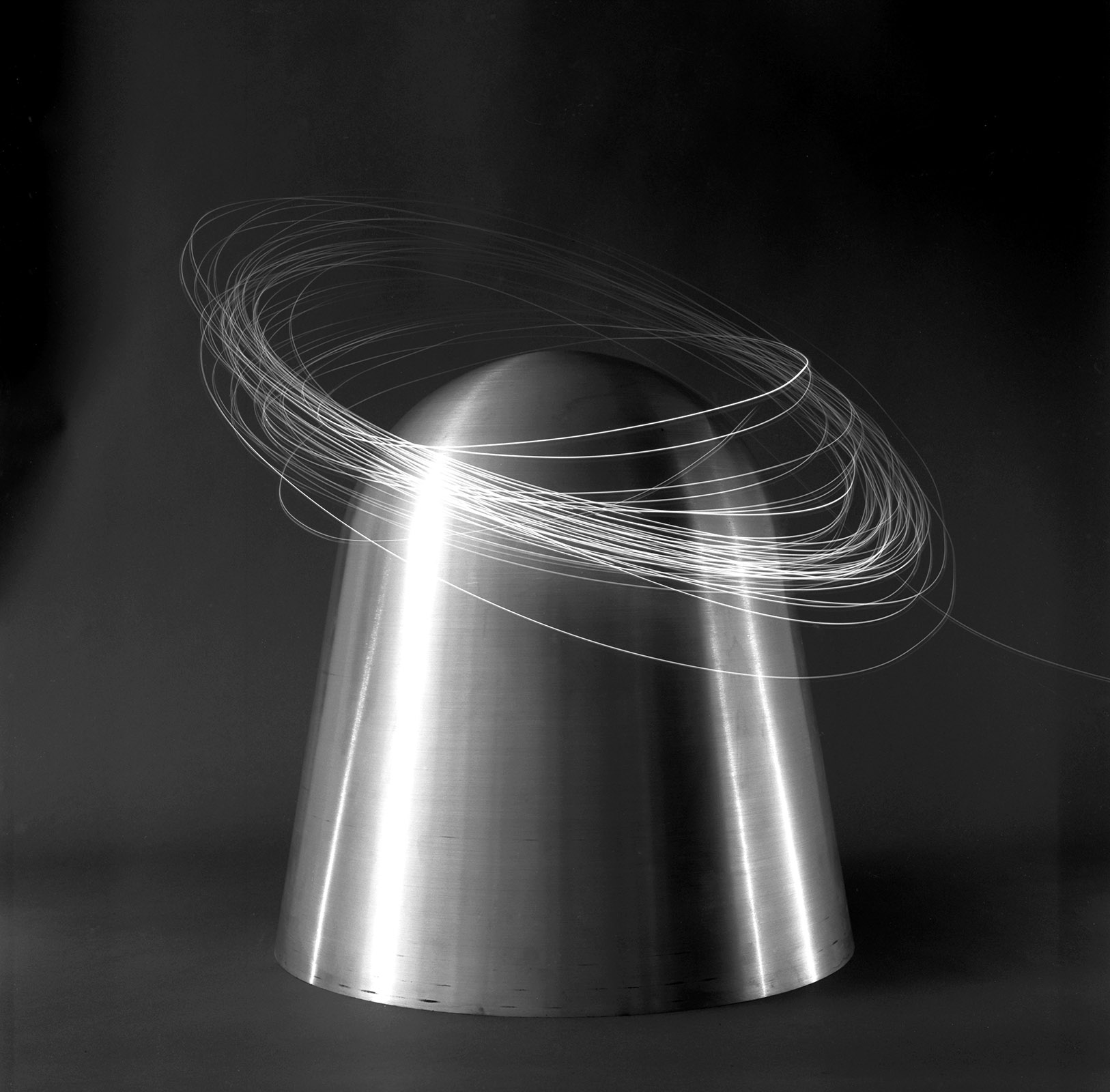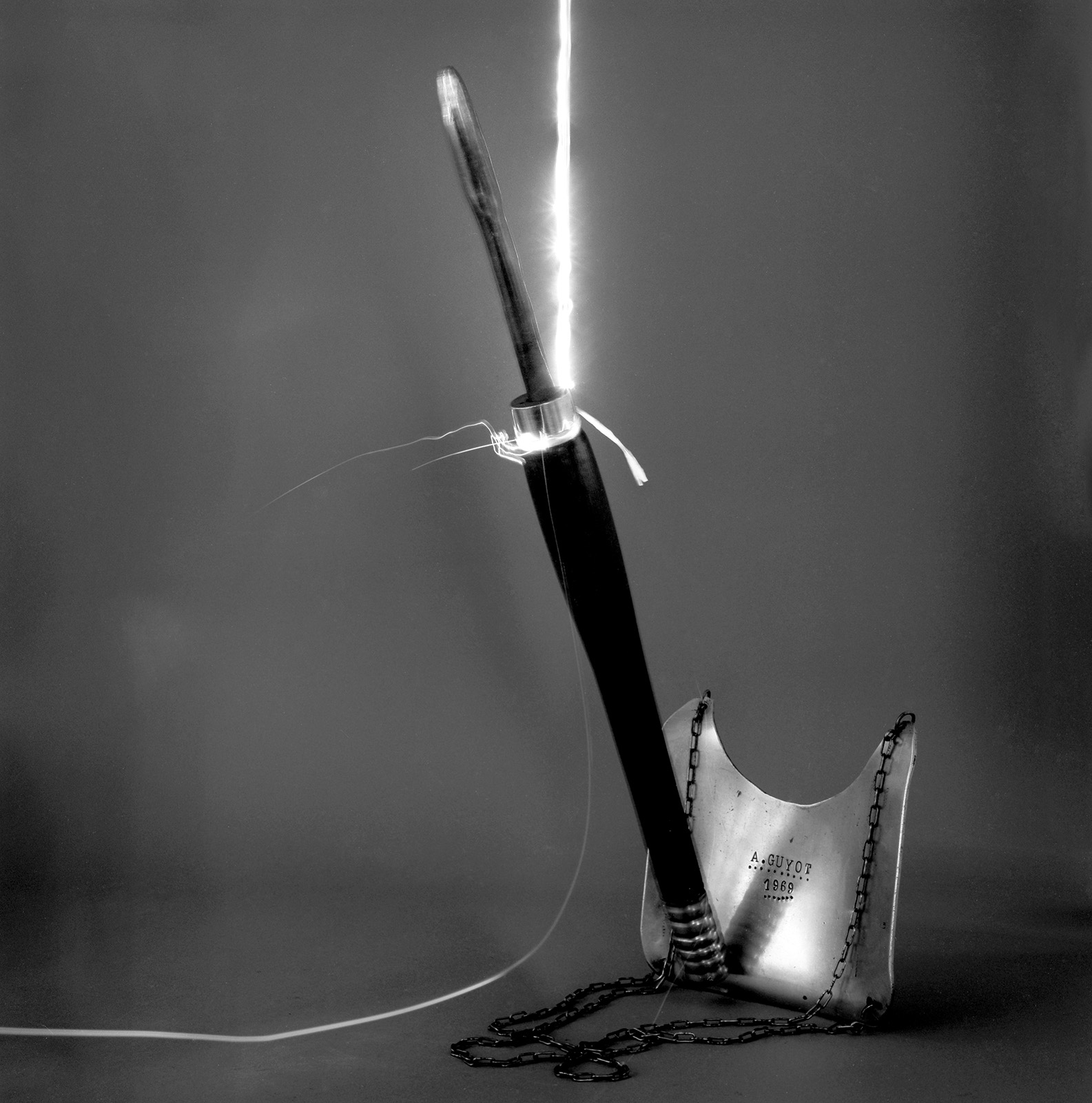A côté de mon atelier rue Oberkampf, se trouvait toujours, mais pour peu de temps, un des derniers tourneur repousseur de Paris.En 1999, j’ai « emprunté » ces outils au Tourneur pour les photographier, les mettant en scène dans l’atelier, sous mes lumières mais pas dans un but documentaire.Intervenant dans l’ombre et devant un fond gris neutre, les outils sont devenus des icônes du travail du Tourneur, dans l’esprit de rendre hommage au travail manuel qui conduit à créer de simple objets et d’autres plus technologiques comme des nez d’avions de ligne.