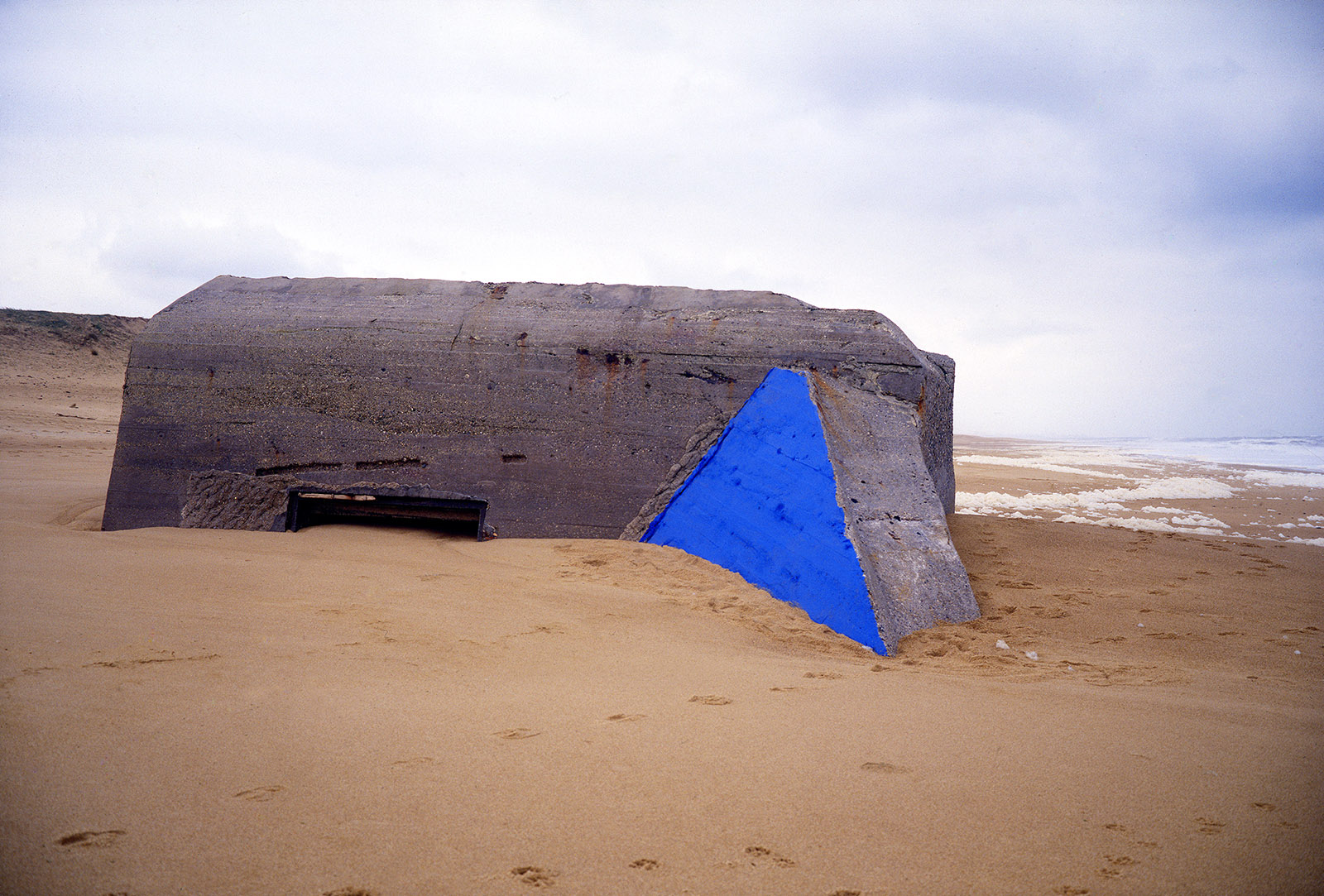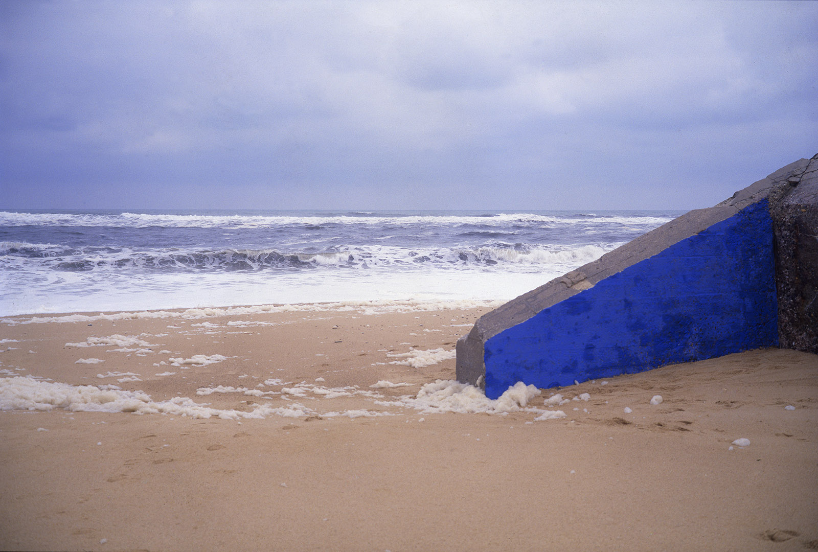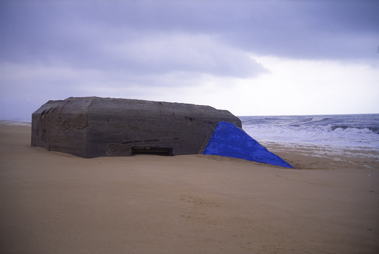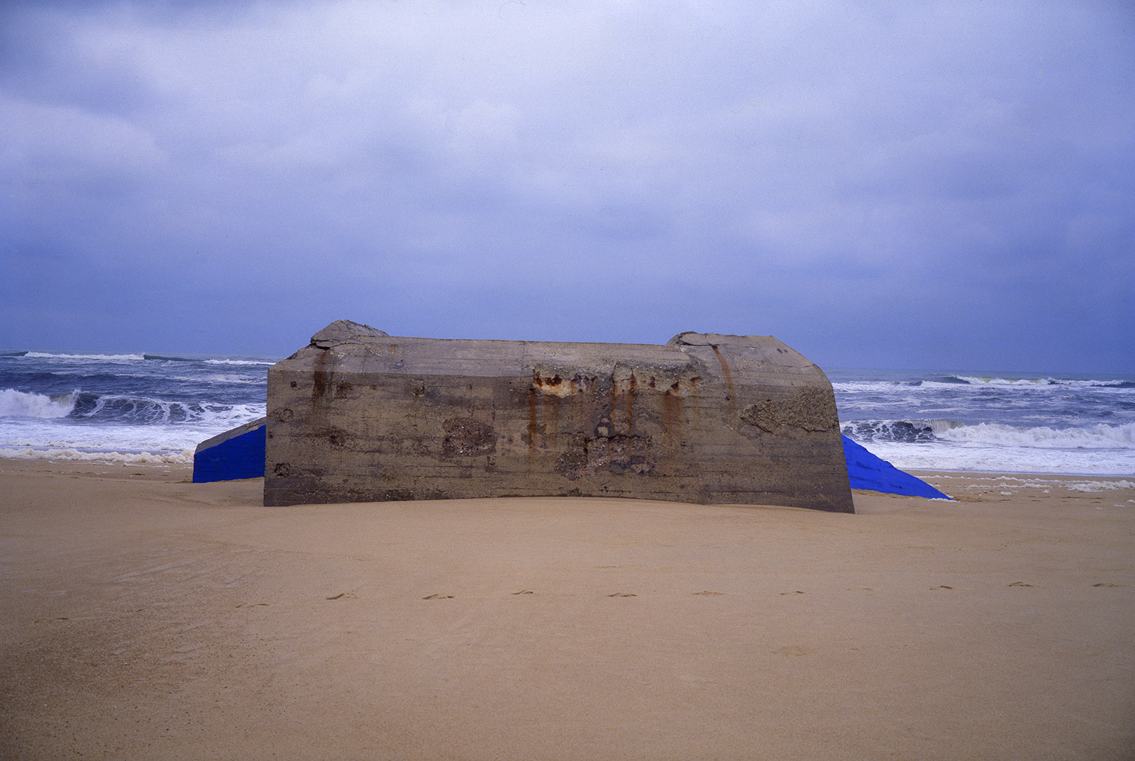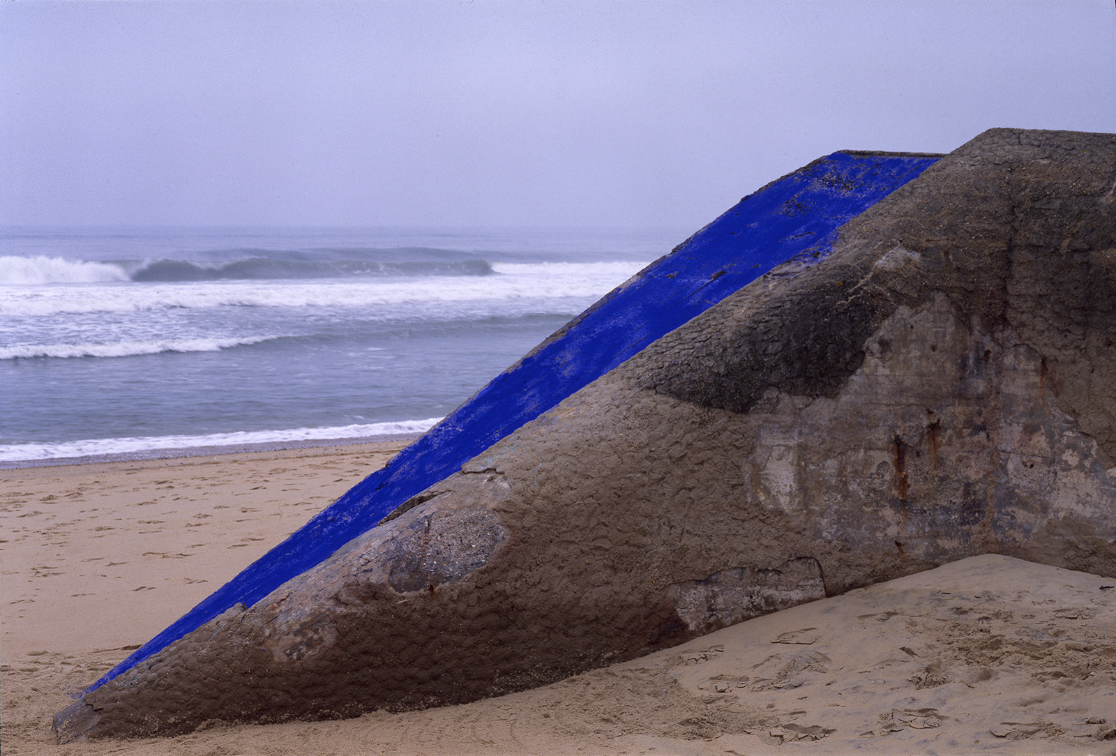 Bien plus tard, à la fin des années 80, quand je commence les installations de pigments de couleur sur les bétons de la Base sous marine de Bordeaux, j’élargis la scène en choisissant un site où ces mégalhites modernes gisent encore sur les plages au nord de Bayonne. En les taguant d’un bleu de ceruleum qu’accompagnent les ciels océaniques de tempête en hiver, ces formes issues du Bauhaus, deviennent des sculptures dérisoires, témoignant pour peu de temps, car elles seront emportées par la mer, de la folie des hommes…