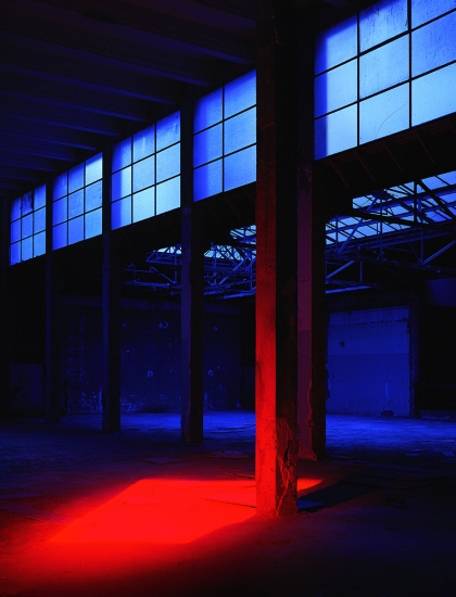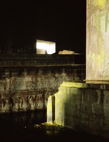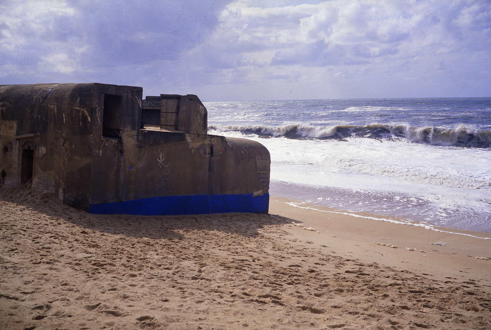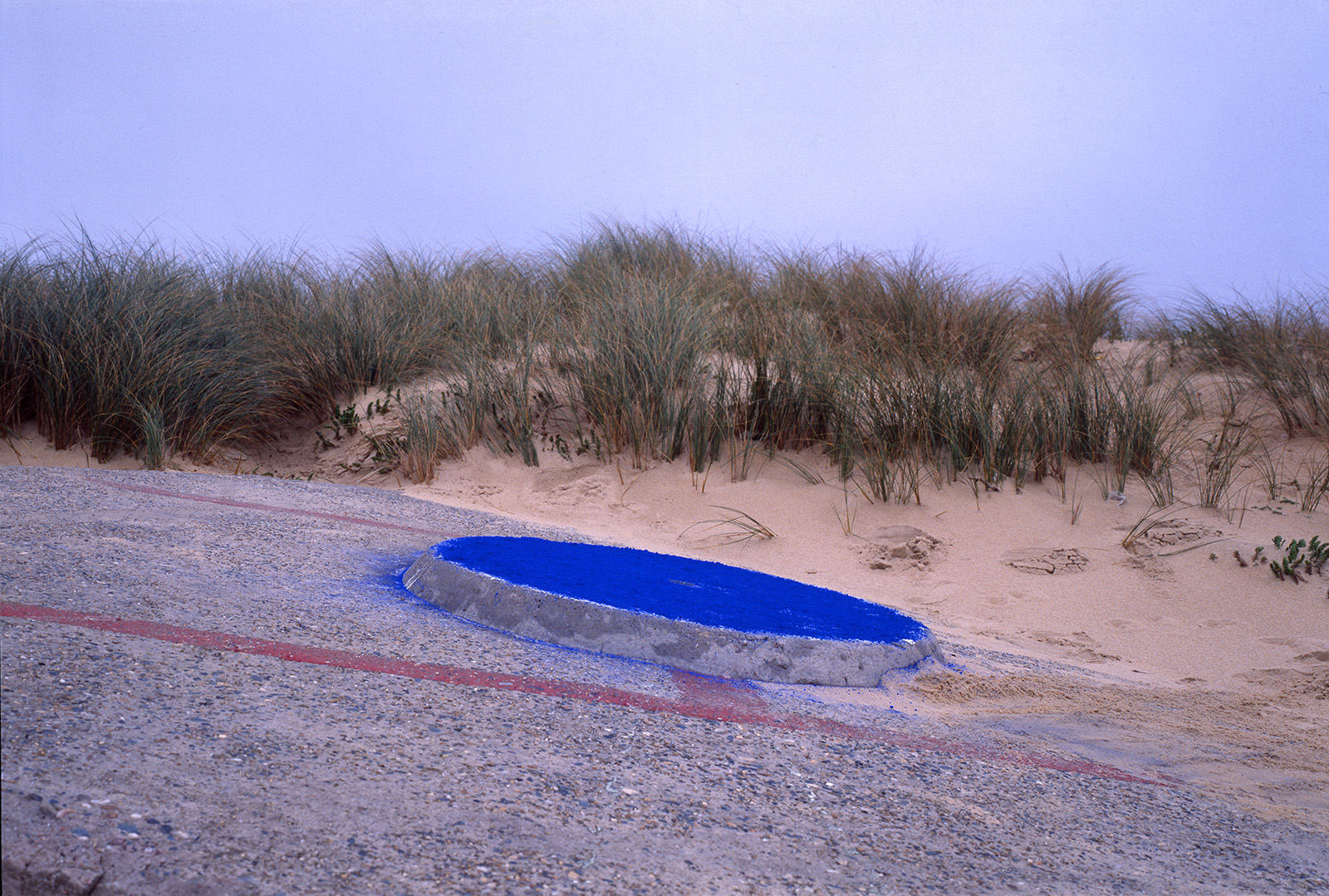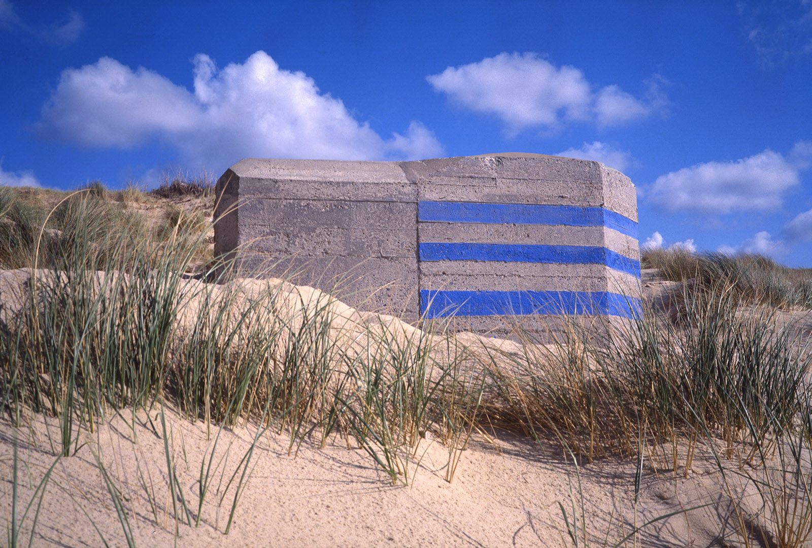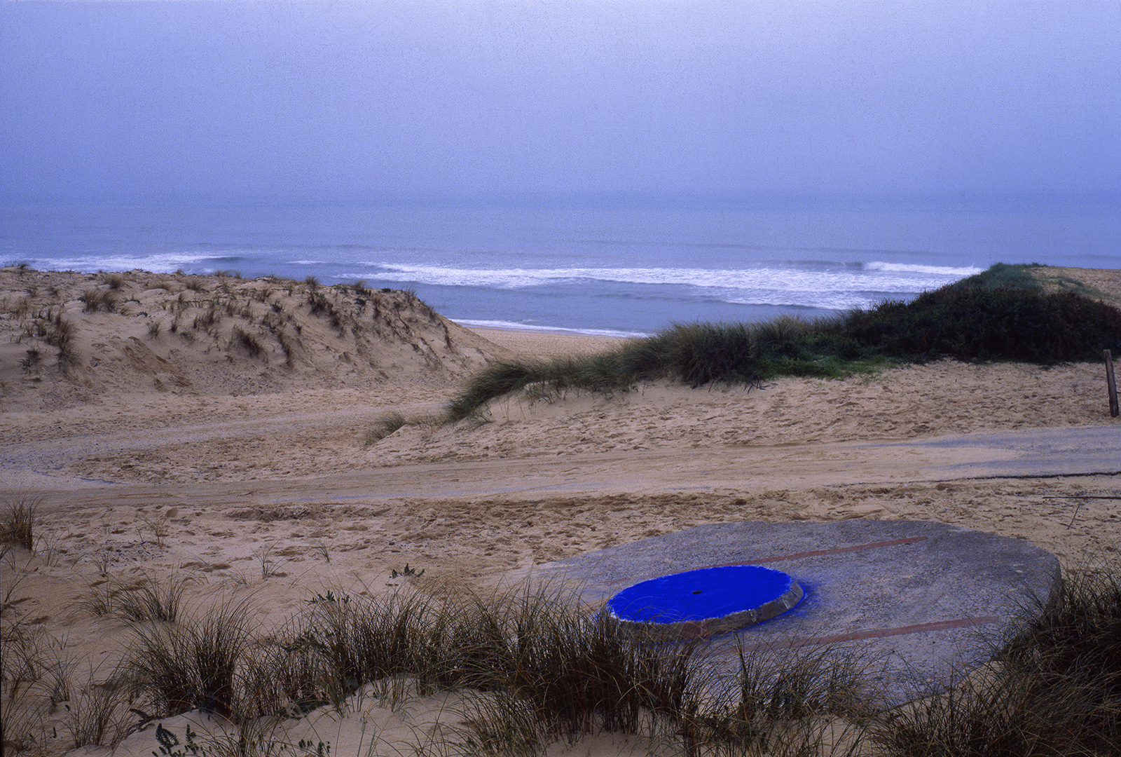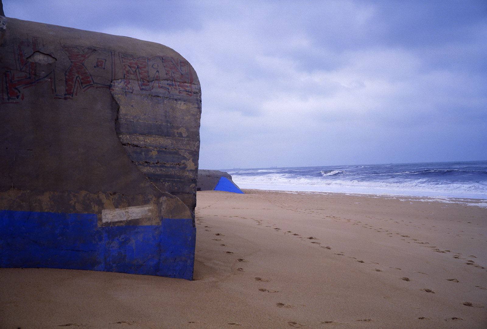 Bien plus tard, à la fin des années 80, quand je commence les installations de pigments de couleur sur les bétons de la Base sous marine de Bordeaux, j’élargis la scène en choisissant un site où ces mégalhites modernes gisent encore sur les plages au nord de Bayonne. En les taguant d’un bleu de ceruleum qu’accompagnent les ciels océaniques de tempête en hiver, ces formes issues du Bauhaus, deviennent des sculptures dérisoires, témoignant pour peu de temps, car elles seront emportées par la mer, de la folie des hommes…