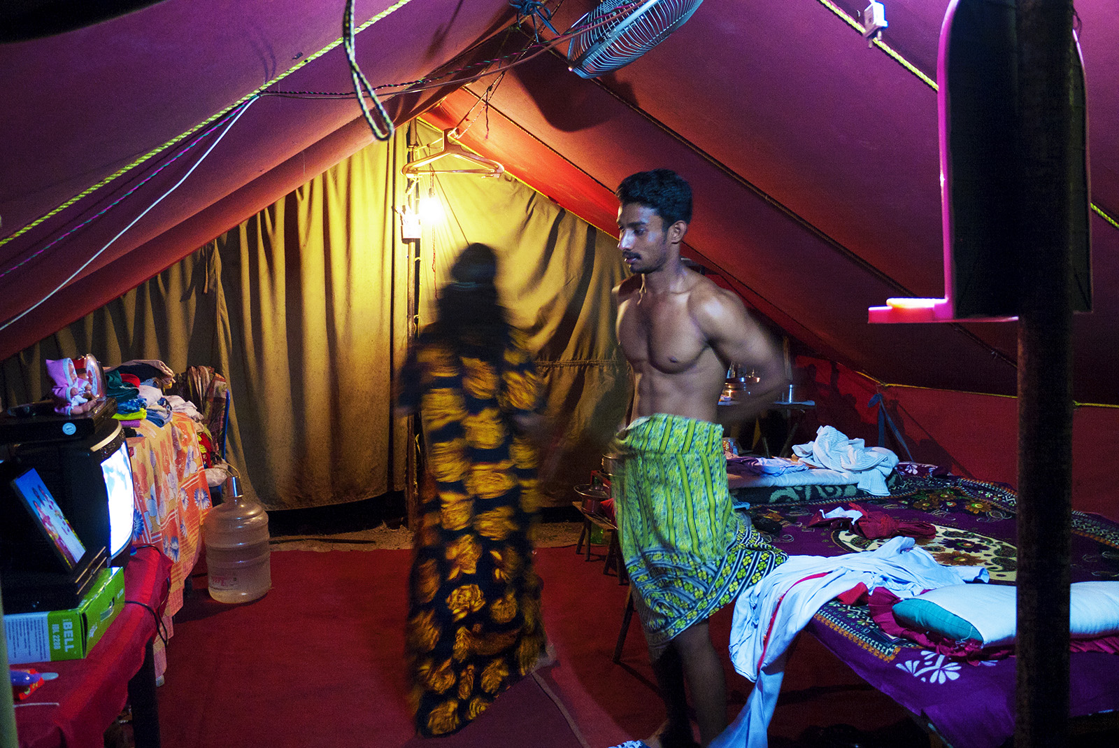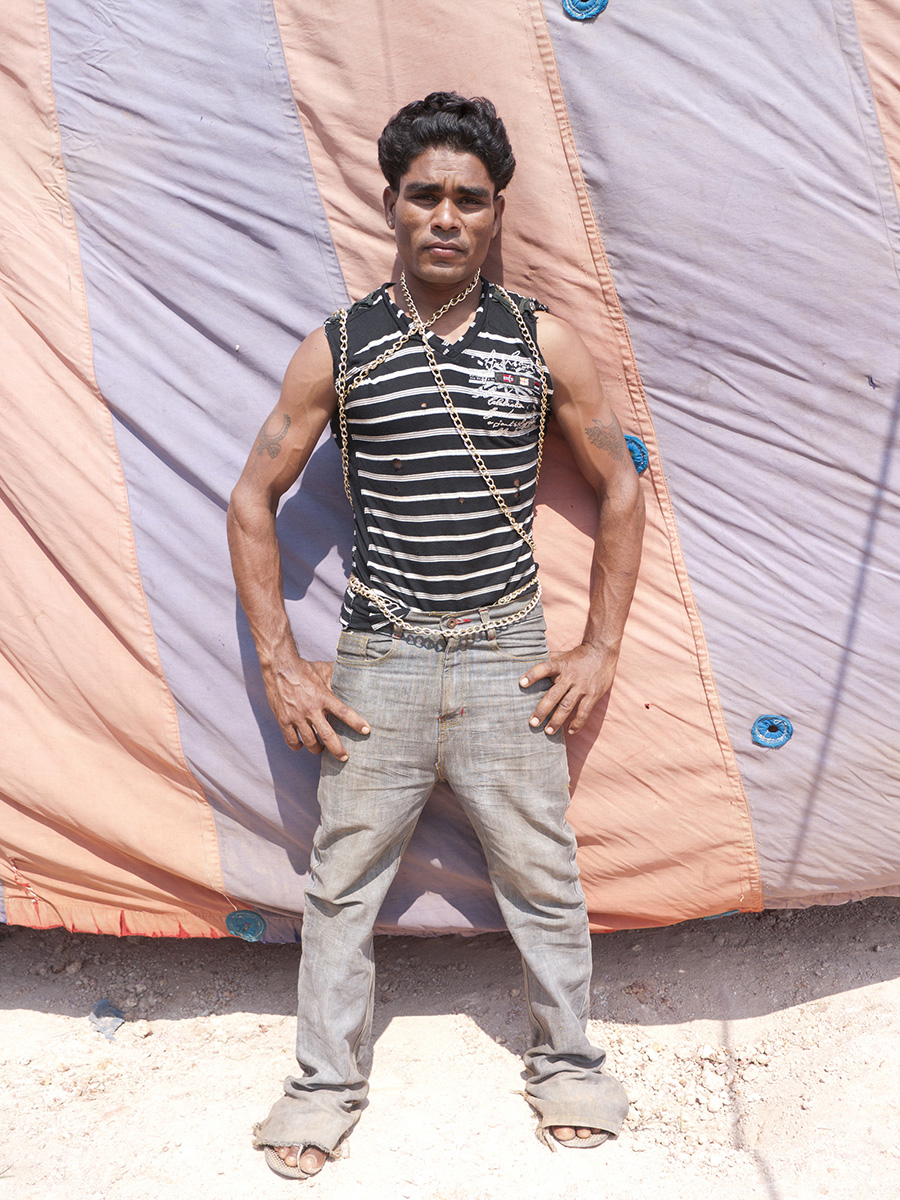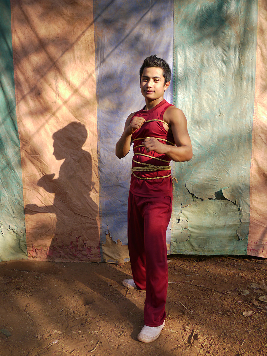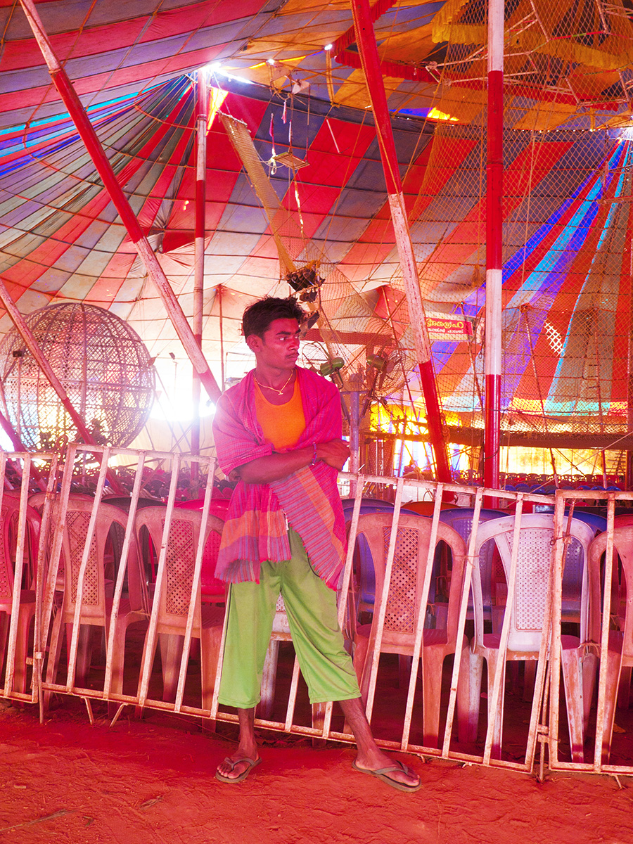 Les personnages des cirques pauvres mais poétiques au Kerala se prêtent avec grâce à leurs portraits scénarisés puis courent pour assurer parfois trois ou quatre représentations par jour et leur fatigue se lit sur leurs beaux visages, tandis qu’en écho, l’abondance du cristal dans les intérieurs des palais expriment en silence la richesse oisive des rajahs.