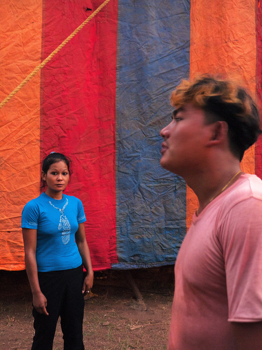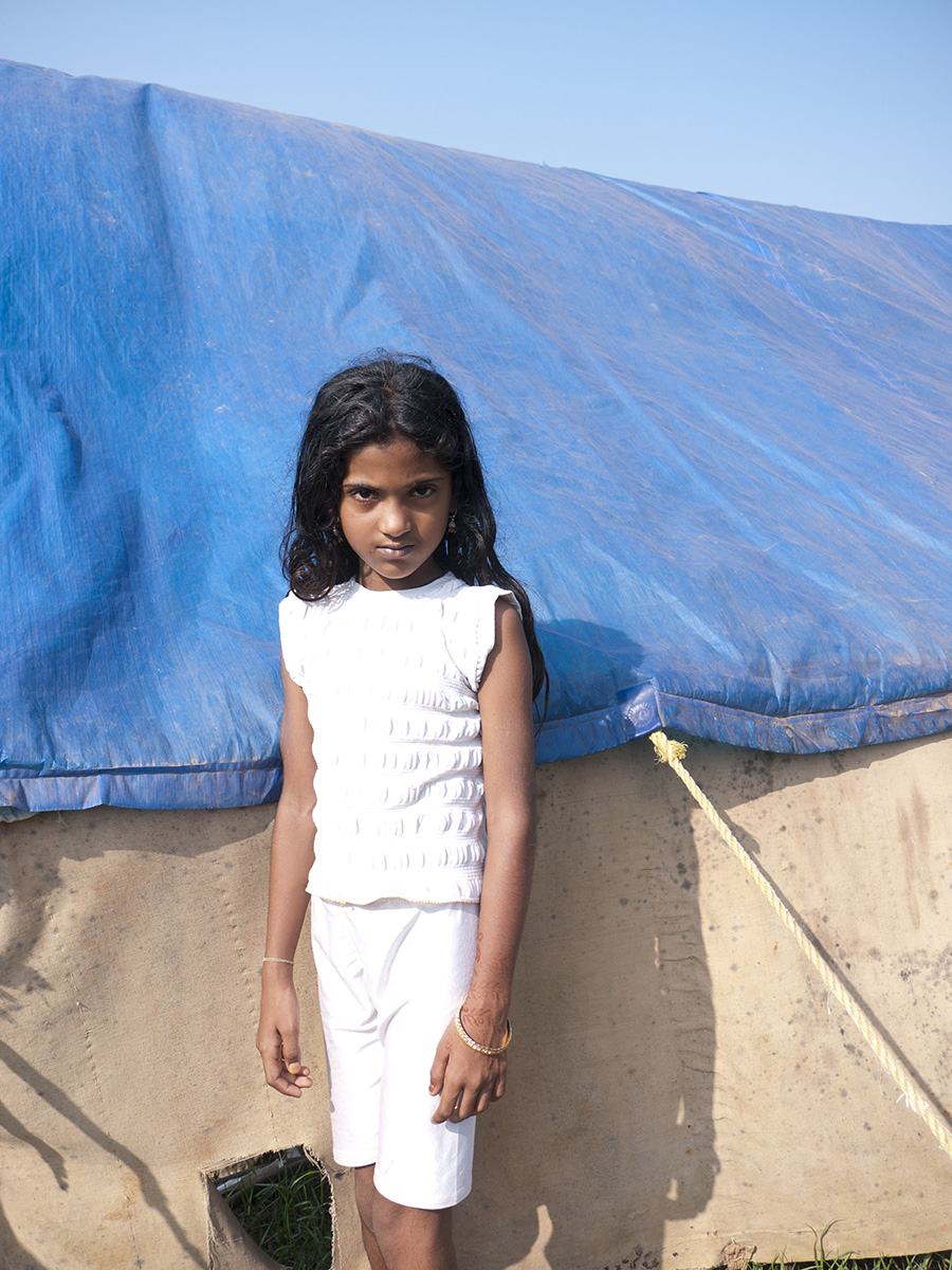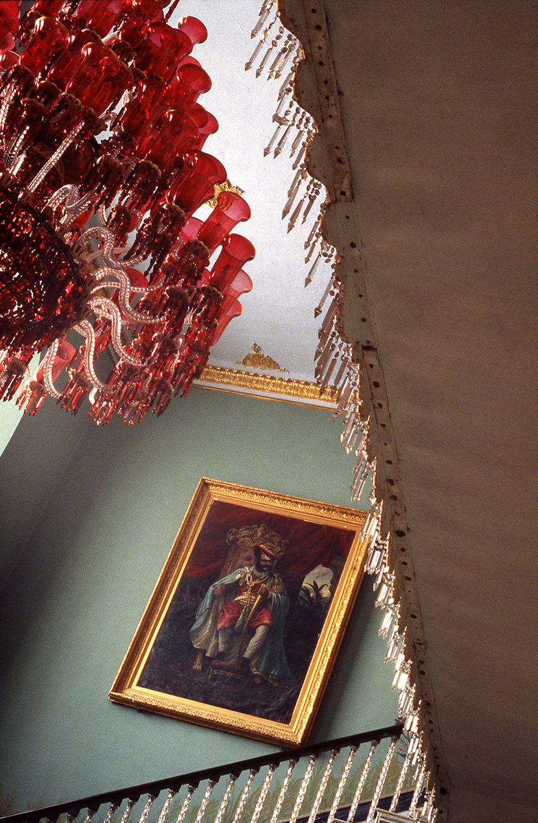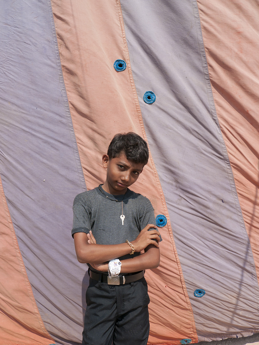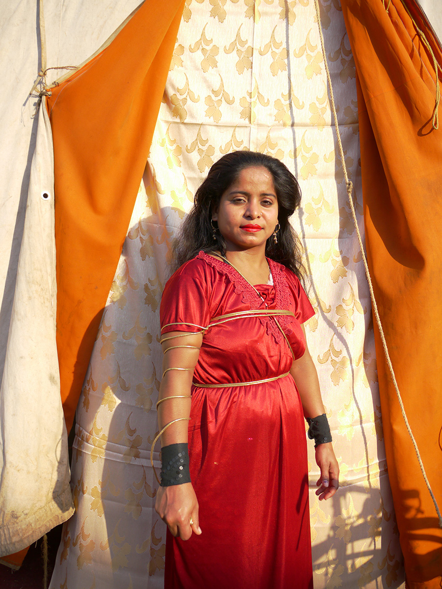 Les personnages des cirques pauvres mais poétiques au Kerala se prêtent avec grâce à leurs portraits scénarisés puis courent pour assurer parfois trois ou quatre représentations par jour et leur fatigue se lit sur leurs beaux visages, tandis qu’en écho, l’abondance du cristal dans les intérieurs des palais expriment en silence la richesse oisive des rajahs.