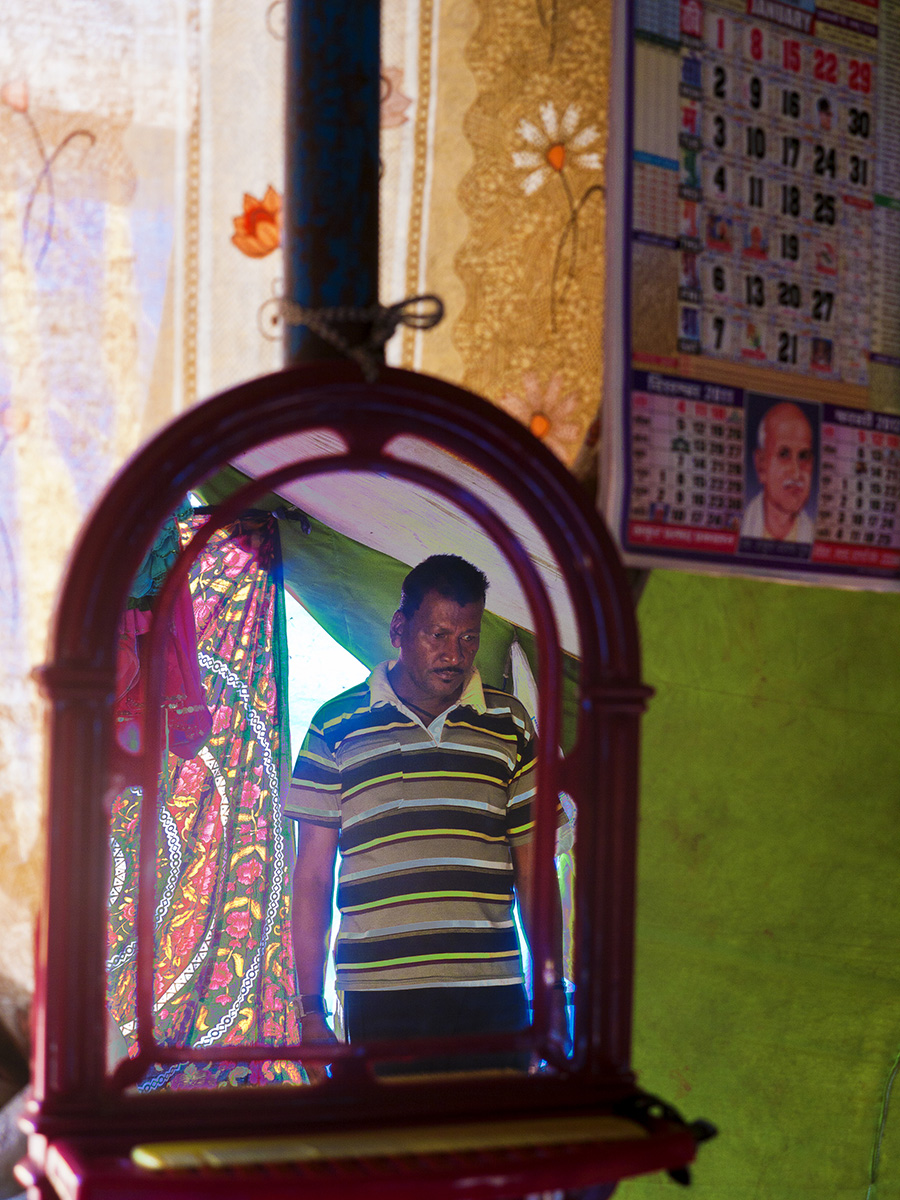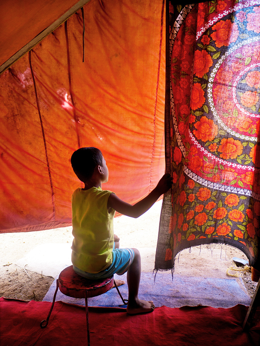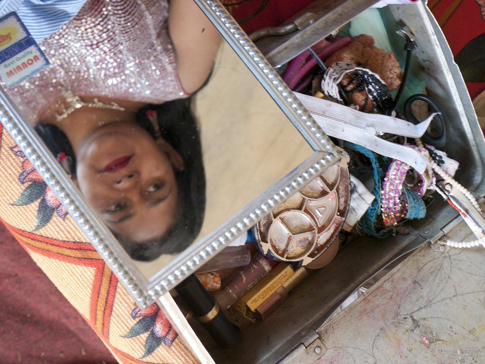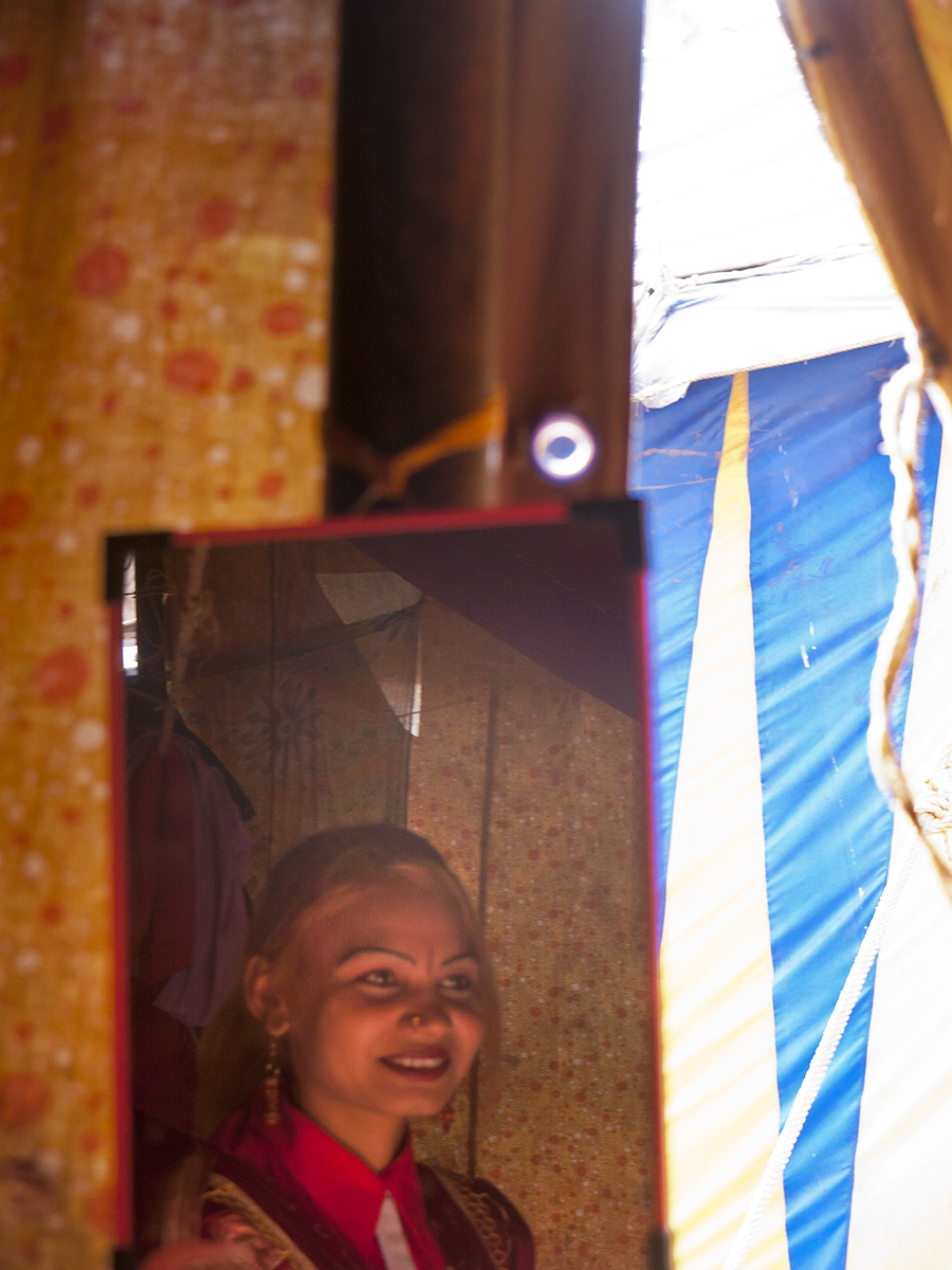Les personnages des cirques pauvres mais poétiques au Kerala se prêtent avec grâce à leurs portraits scénarisés puis courent pour assurer parfois trois ou quatre représentations par jour et leur fatigue se lit sur leurs beaux visages, tandis qu’en écho, l’abondance du cristal dans les intérieurs des palais expriment en silence la richesse oisive des rajahs.